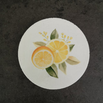 Dessa är gjorda i flytspackel, målade och lackade. Dom säljs i set med 4 st + en hållare/ förvaringsställ Måttet är ca 8,5 cm i diameter (underläggen).